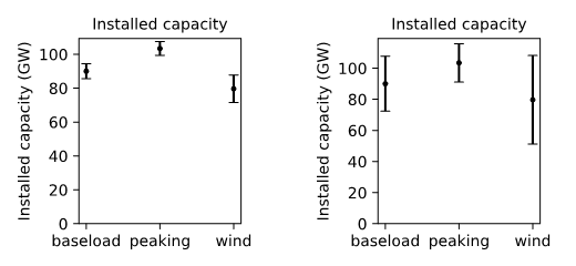 Consider two different scenarios Model A and Model B. Both indicate the optimal mix of baseload (e.g. nuclear), peaking (e.g. gas) and wind technologies to meet demand in a large European region. The dots and error bars indicate the point estimate and uncertainty bounds respectively.