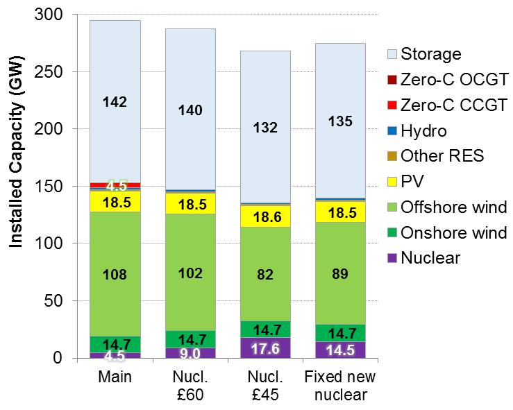Figure 1. GB system for net-zero with variations in cost of nuclear generation: total installed capacities