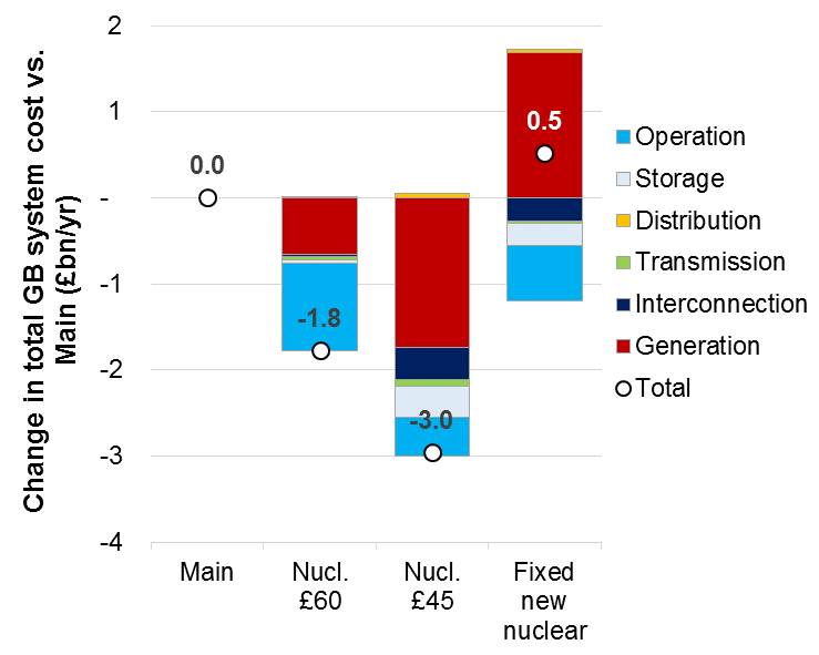 Figure 2. GB system for net-zero with variations in cost of nuclear generation: changes in annual total system cost vs. Main scenario